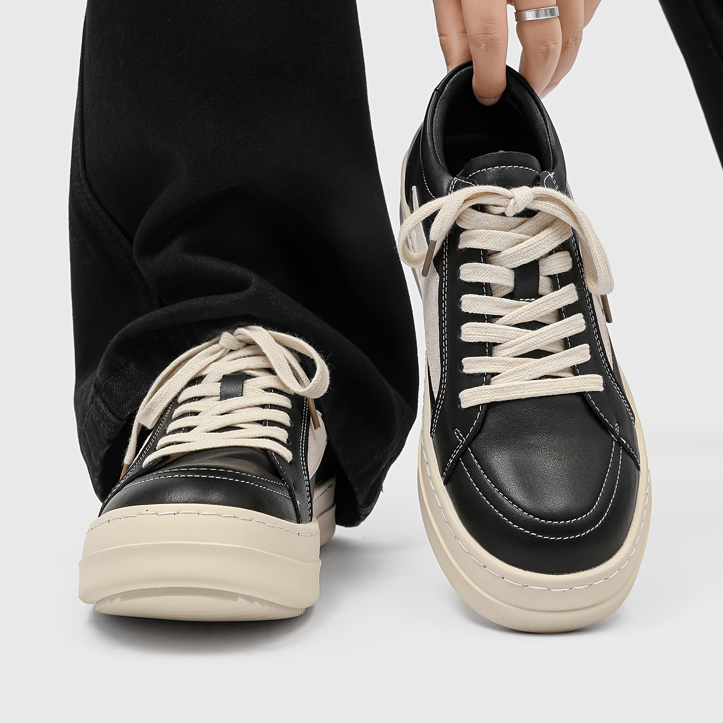 Men's Skate Shoes - Thick Platform Sole for Height Increase & Cushioned Grip - Black/Beige Colorway - PU Upper & Non-Slip Rubber Outsole - Lace-Up Low-Top Sneakers for Streetwear, Skateboarding, Gym, Everyday - All-Season Urban Fashion Shoes