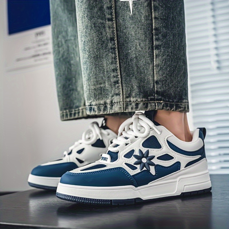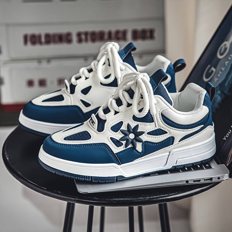 [Trendy Sneakers] Stylish Black & Yellow Men's Fashion Floral Contrast Sneakers | Low-Top Skate Shoes with Thick Lace-Up, Comfortable Rubber Sole for Casual and Outdoor Wear